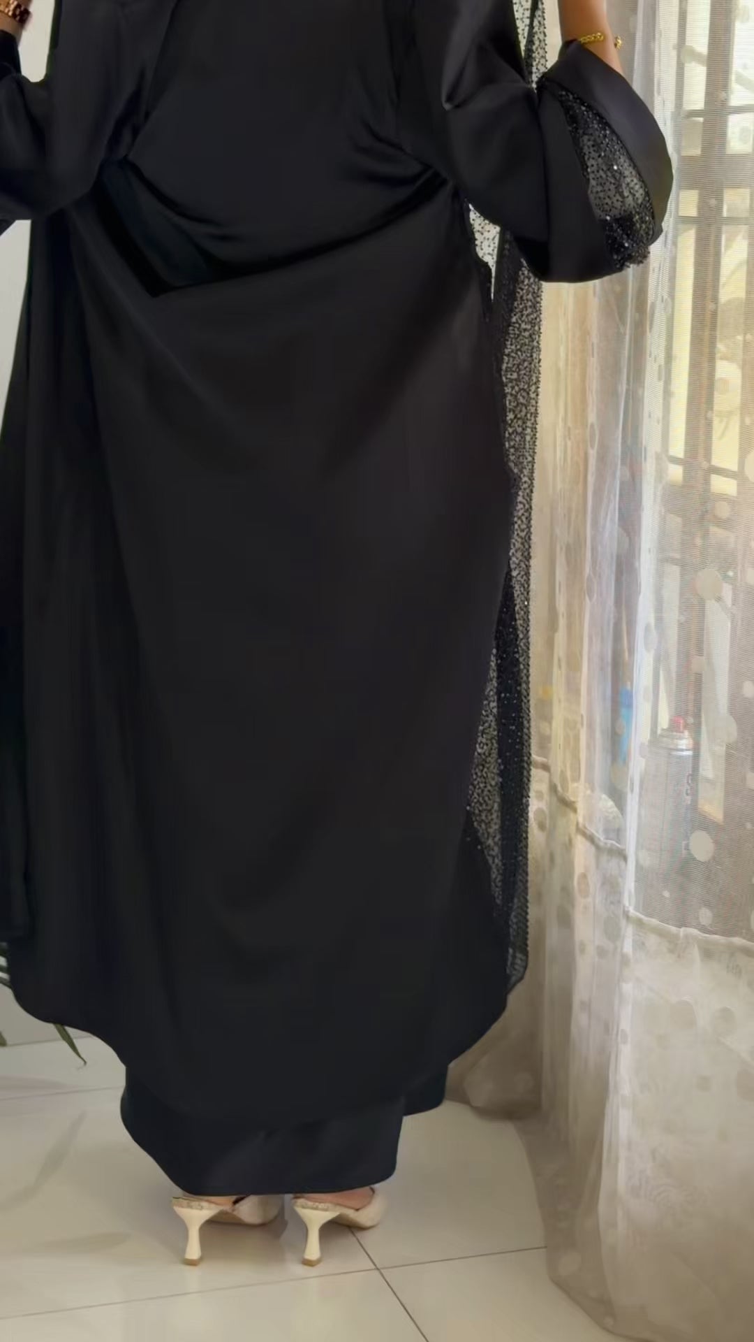 Black Beaded Thin Line And D0uble Sleeved Abaya