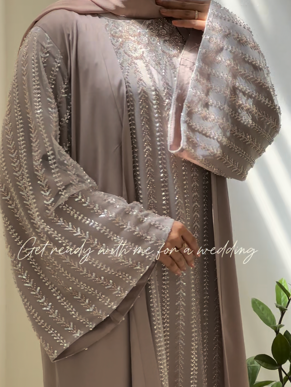 A full-coverage occasion piece featuring all-over chevron and leaf-patterned stone work. The silver and rose-gold threadwork creates a shimmering lattice effect against the soft mauve fabric. Its dramatic wide-flare sleeves and open-front style offer a regal, fluid movement, making it a standout choice for weddings and celebrations.